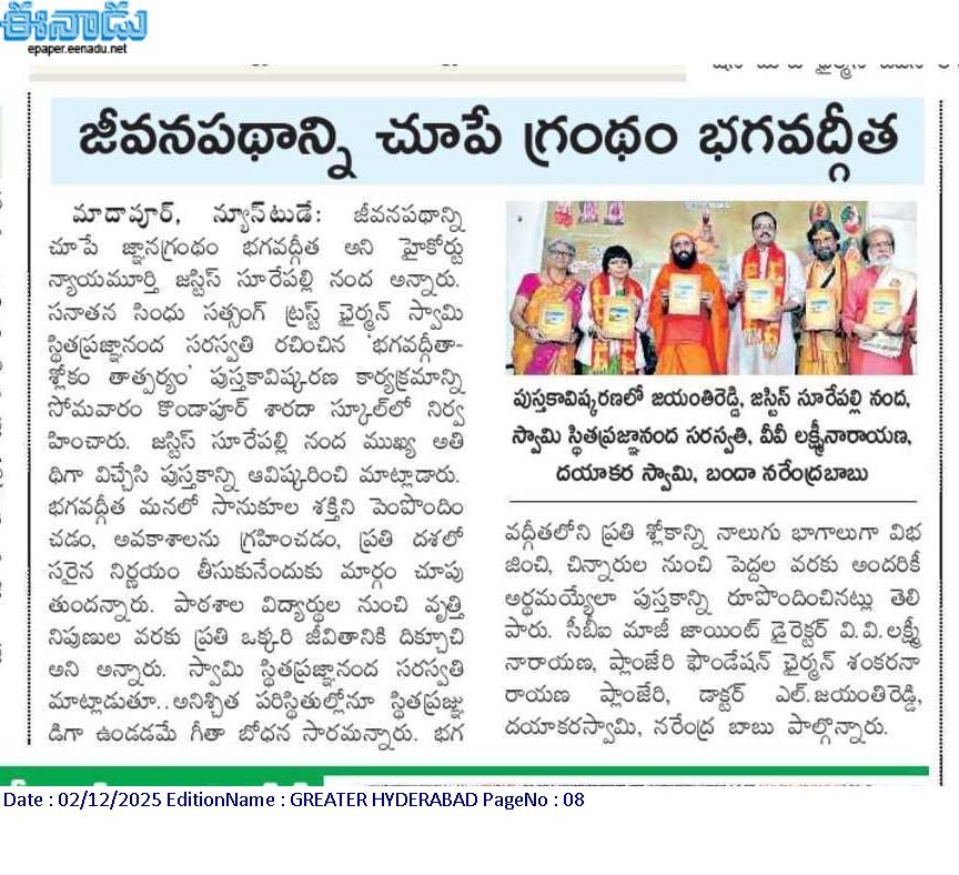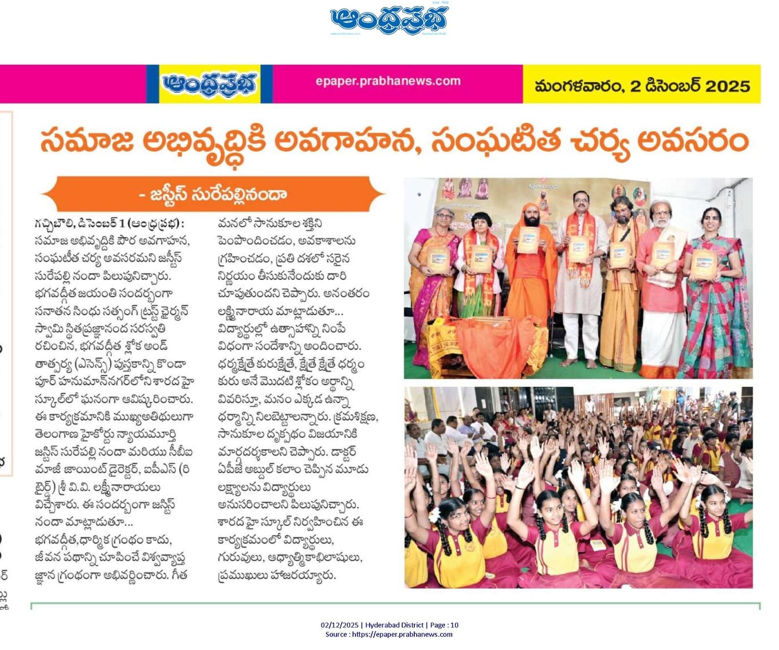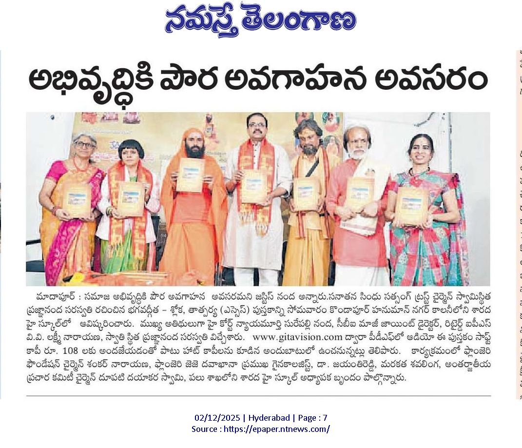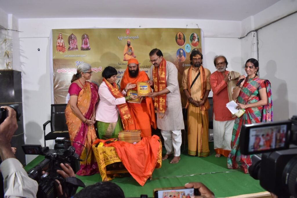 The sacred launch ceremony was graciously presided over by Justice Surepalli Nanda, Hon’ble Judge, Telangana High Court, who reflected upon the eternal relevance of the Bhagavad Gita as a divine guide for righteousness, clarity of thought, inner discipline, compassion, and integrity in contemporary life. He appreciated the noble effort of Swami Sthitaprajnananda Saraswati in presenting the timeless wisdom of the Gita in Telugu, making it accessible to a wider section of society.