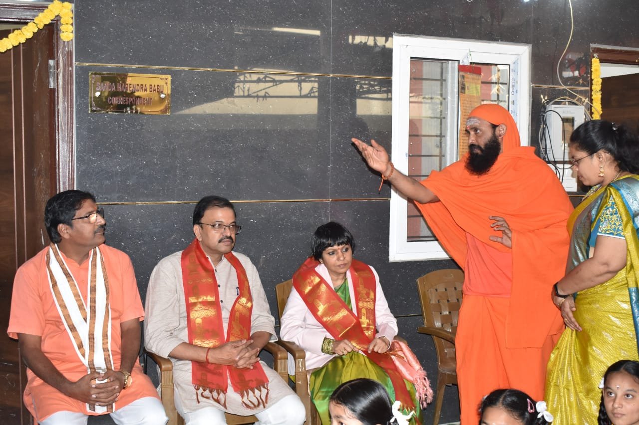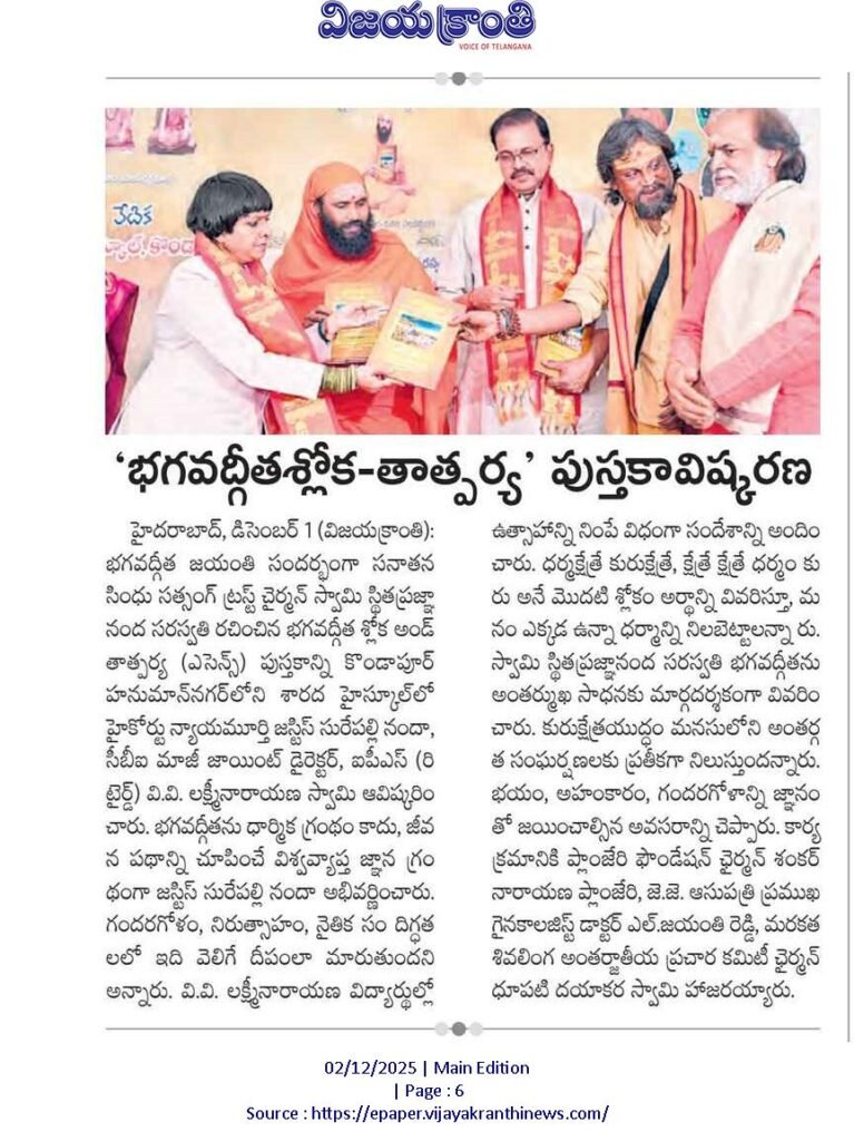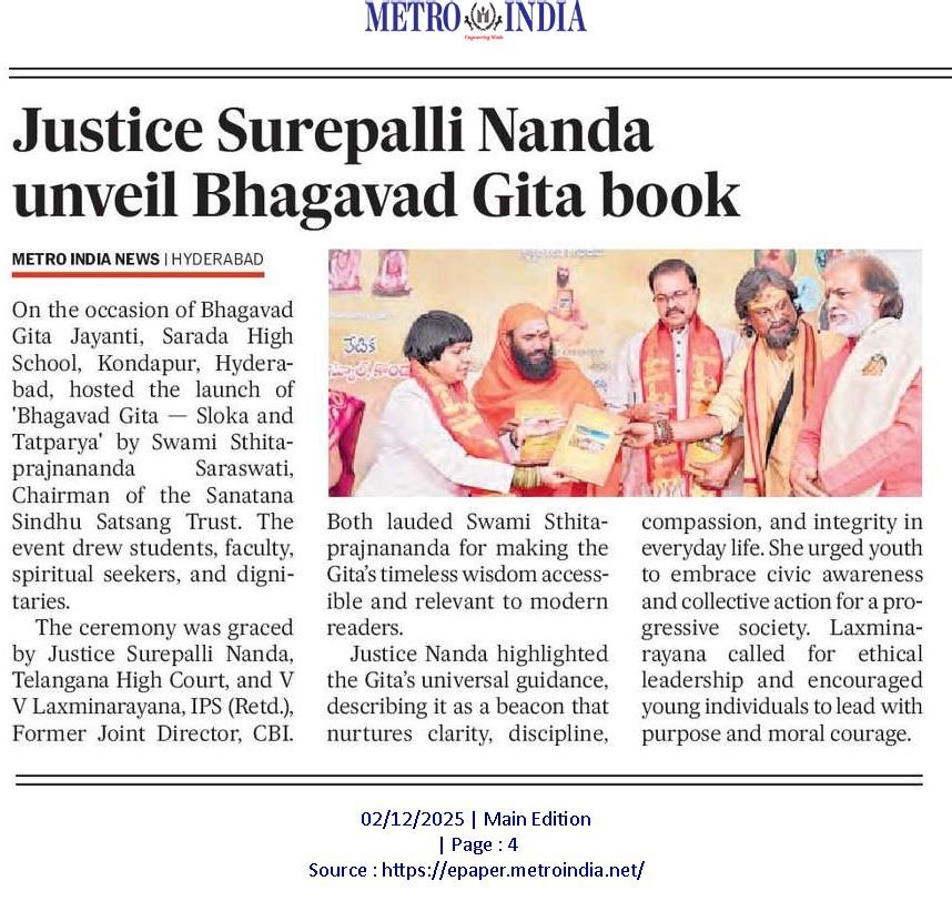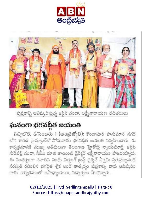 The sacred launch ceremony was graciously presided over by Justice Surepalli Nanda, Hon’ble Judge, Telangana High Court, who reflected upon the eternal relevance of the Bhagavad Gita as a divine guide for righteousness, clarity of thought, inner discipline, compassion, and integrity in contemporary life. He appreciated the noble effort of Swami Sthitaprajnananda Saraswati in presenting the timeless wisdom of the Gita in Telugu, making it accessible to a wider section of society.