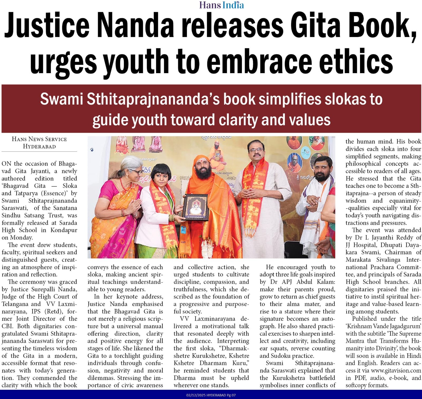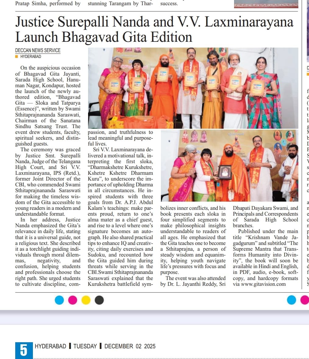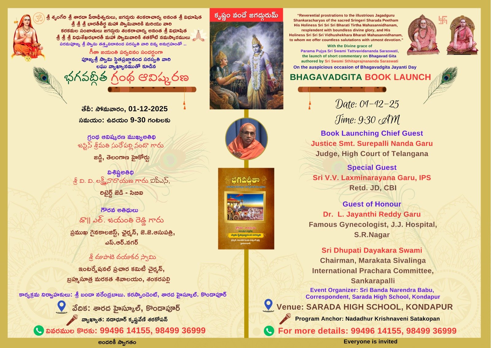 The book was unveiled on the auspicious occasion of Bhagavad Gita Jayanti, on 1 December 2025, at Sarada High School, Kondapur, Hyderabad, amidst the divine presence of saints, scholars, educators, students, and seekers of spiritual wisdom.