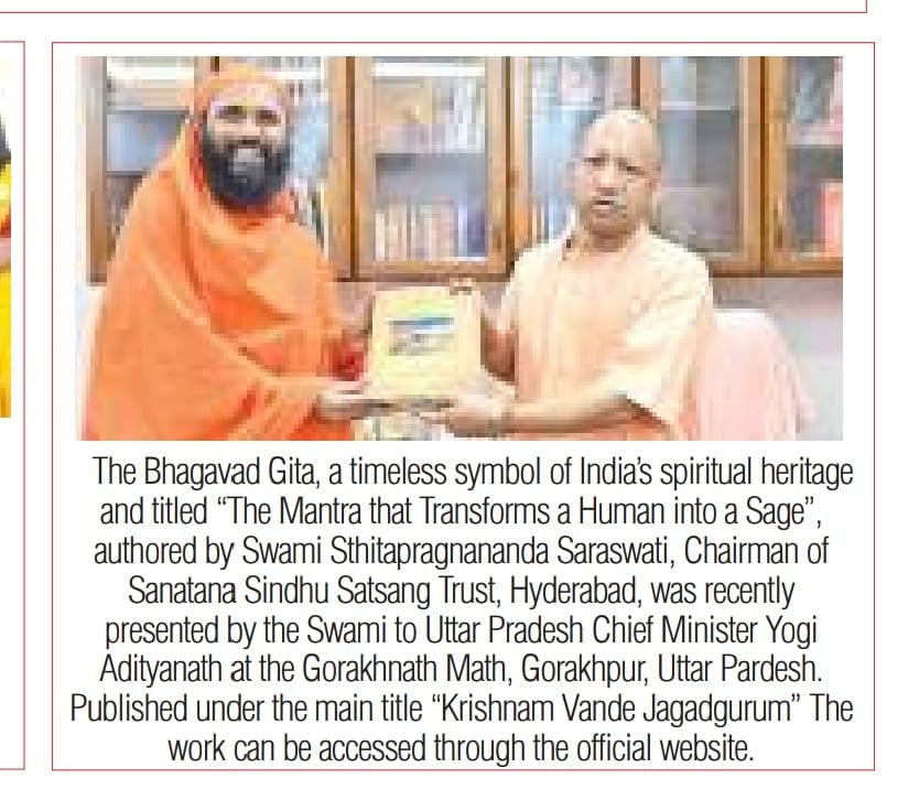 Hyderabad, October 28, 2025: The Bhagavad Gita, a timeless symbol of India’s spiritual heritage and titled “The Mantra that Transforms a Human into a Sage”, authored by Swami Sthitaprajnananda Saraswati, Chairman of Sanatana Sindhu Satsang Trust, Hyderabad, was recently presented by the Swami to Uttar Pradesh Chief Minister Yogi Adityanath at the Gorakhpur Math, Gorakhpur.